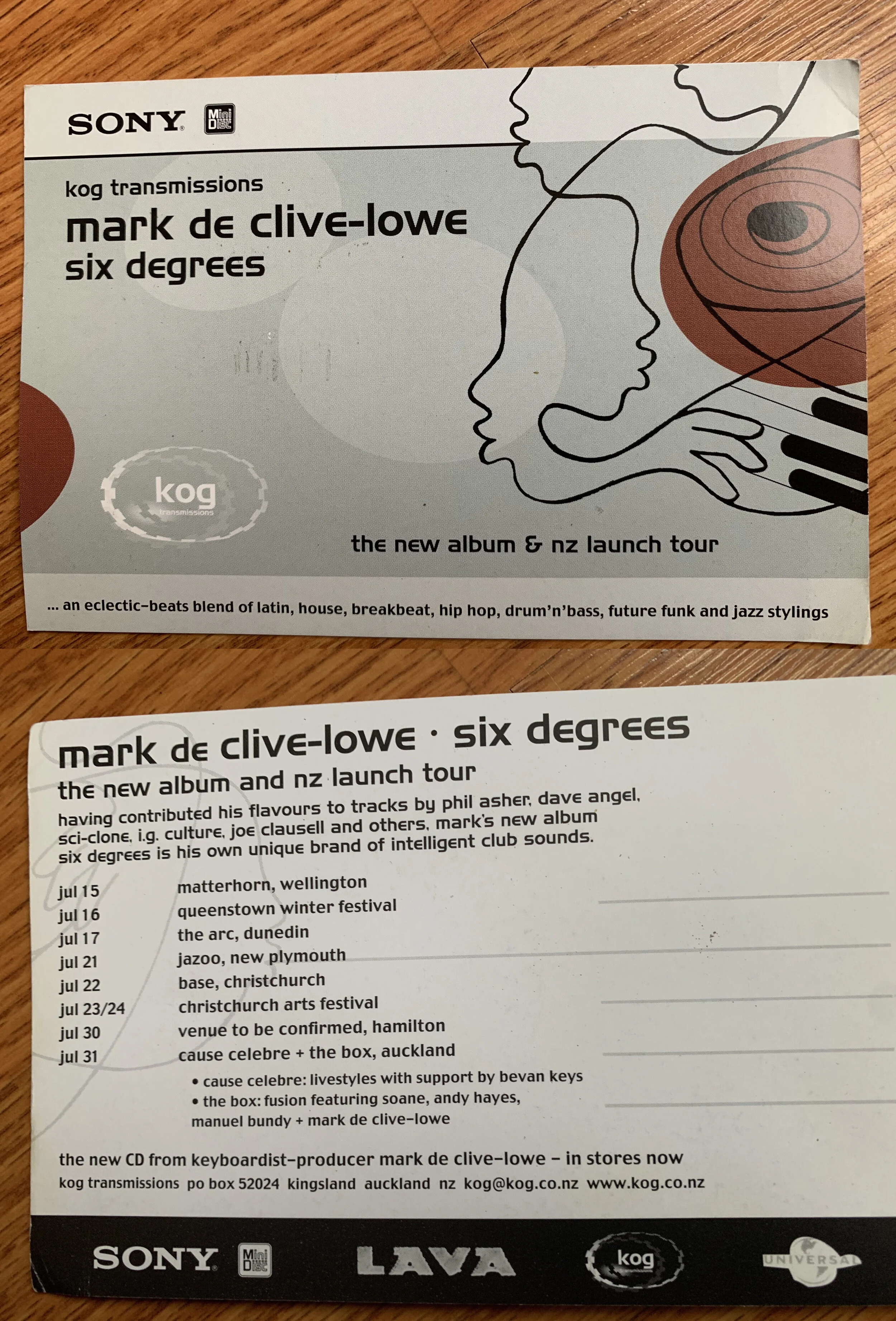The promotional postcard for the NZ launch tour of my album Six Degrees (1999)